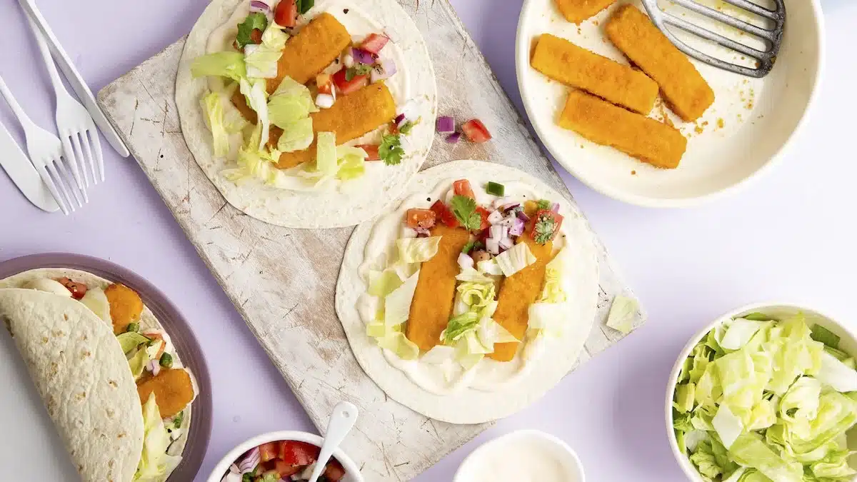 For garnishes, the recipe suggests salad leaves, cucumber, and tomatoes — all of which add freshness and a slight crunch that contrasts with the soft tortilla and crispy fish. None are mandatory, but a handful of shredded lettuce or a few cucumber slices genuinely improve the final result.